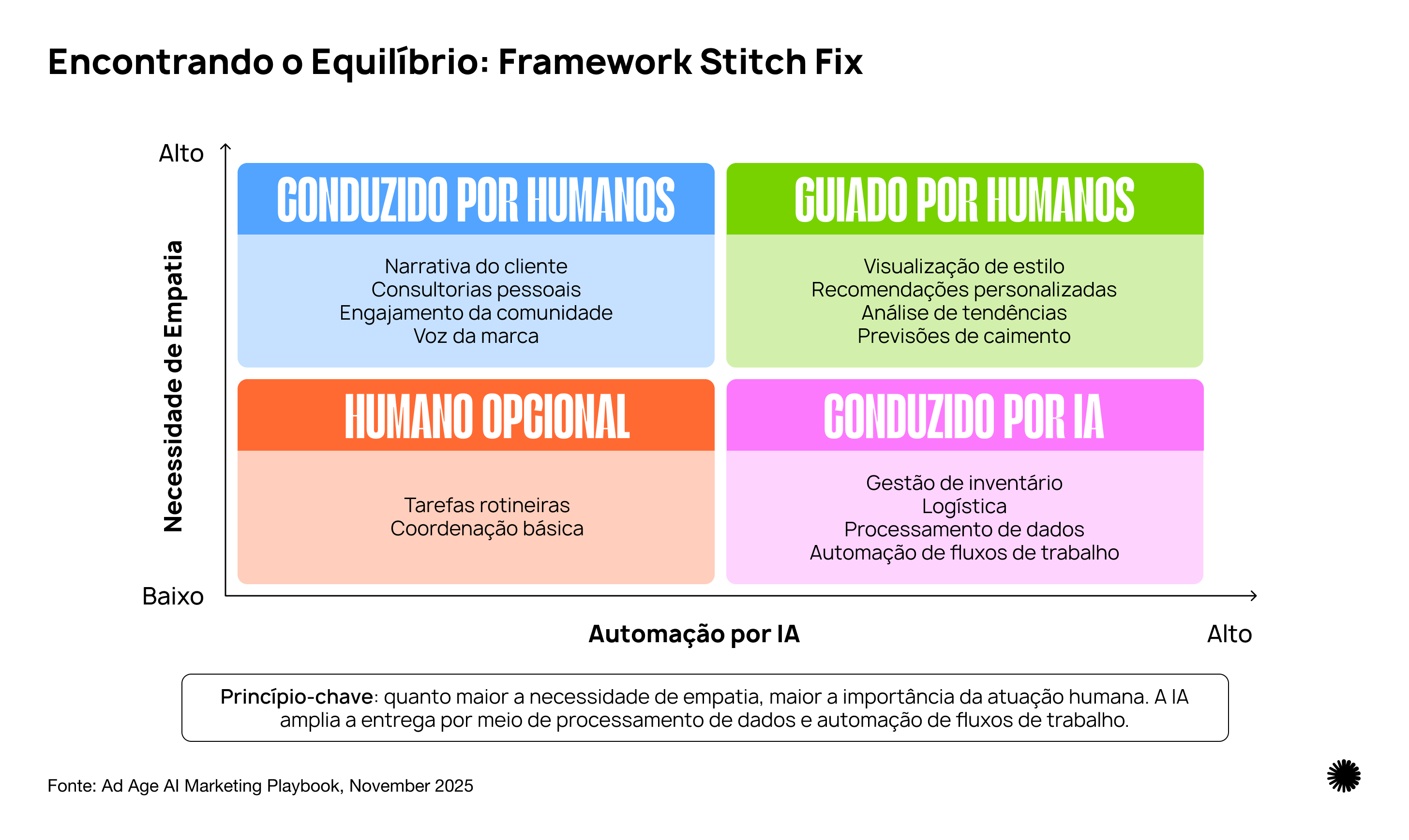 Segundo o AI Marketing Playbook da Ad Age de novembro de 2025, as marcas mais bem-sucedidas não estão escolhendo entre IA e criatividade humana—estão descobrindo como orquestrar ambas em harmonia. Como diz Debbie Woloshin, CMO da Stitch Fix: "A IA oferece tremendas oportunidades para melhorar como trabalhamos. Ela nos ajuda a avançar mais rápido, identificar insights mais rapidamente, escalar a produção criativa e aprofundar a personalização. No entanto, o que a IA não pode fornecer é empatia."