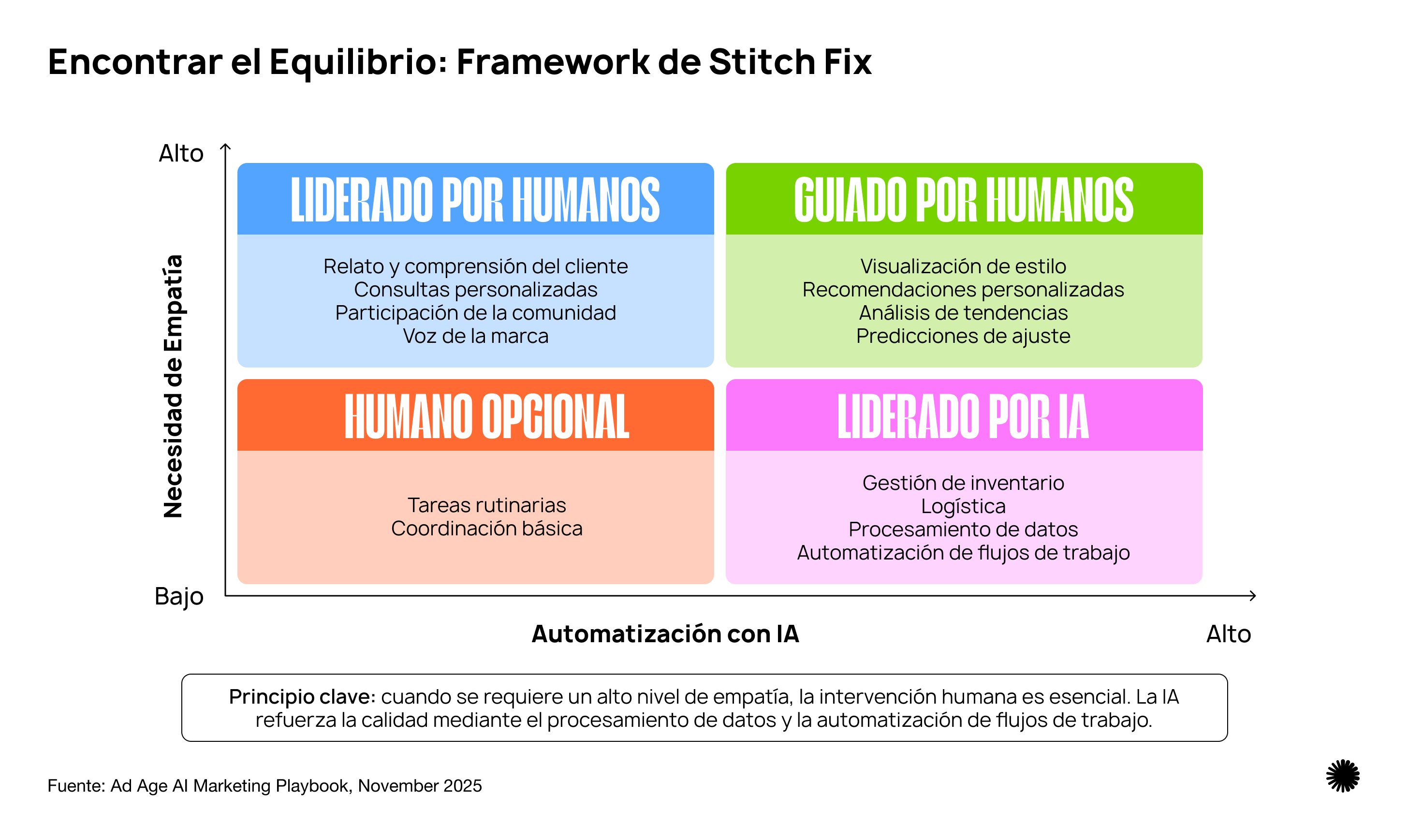 Según el AI Marketing Playbook de Ad Age de noviembre de 2025, las marcas más exitosas no están eligiendo entre IA y creatividad humana—están descubriendo cómo orquestar ambas en armonía. Como dice Debbie Woloshin, CMO de Stitch Fix: "La IA ofrece tremendas oportunidades para mejorar cómo trabajamos. Nos ayuda a avanzar más rápido, identificar insights más rápidamente, escalar la producción creativa y profundizar la personalización. Sin embargo, lo que la IA no puede proporcionar es empatía."