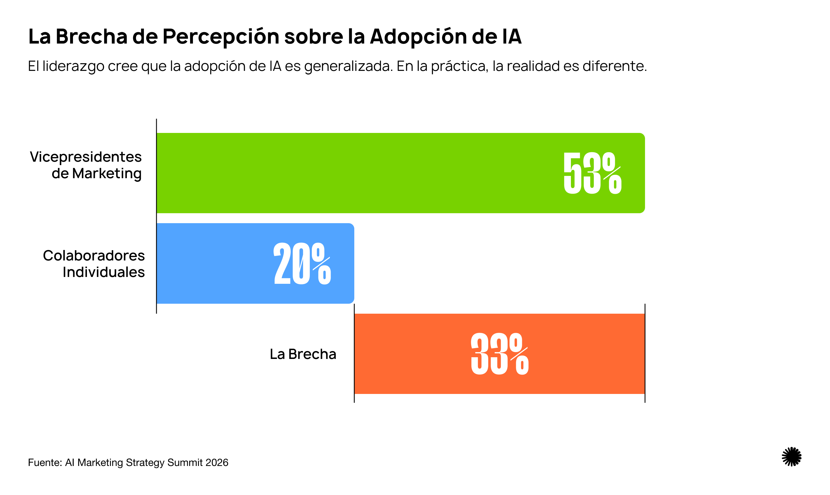 La investigación del Summit mostró un patrón: 53% de los VPs de Marketing reportan "adopción generalizada de IA" mientras que 20% de los profesionales coinciden. (Fuente: AI Marketing Strategy Summit 2026)