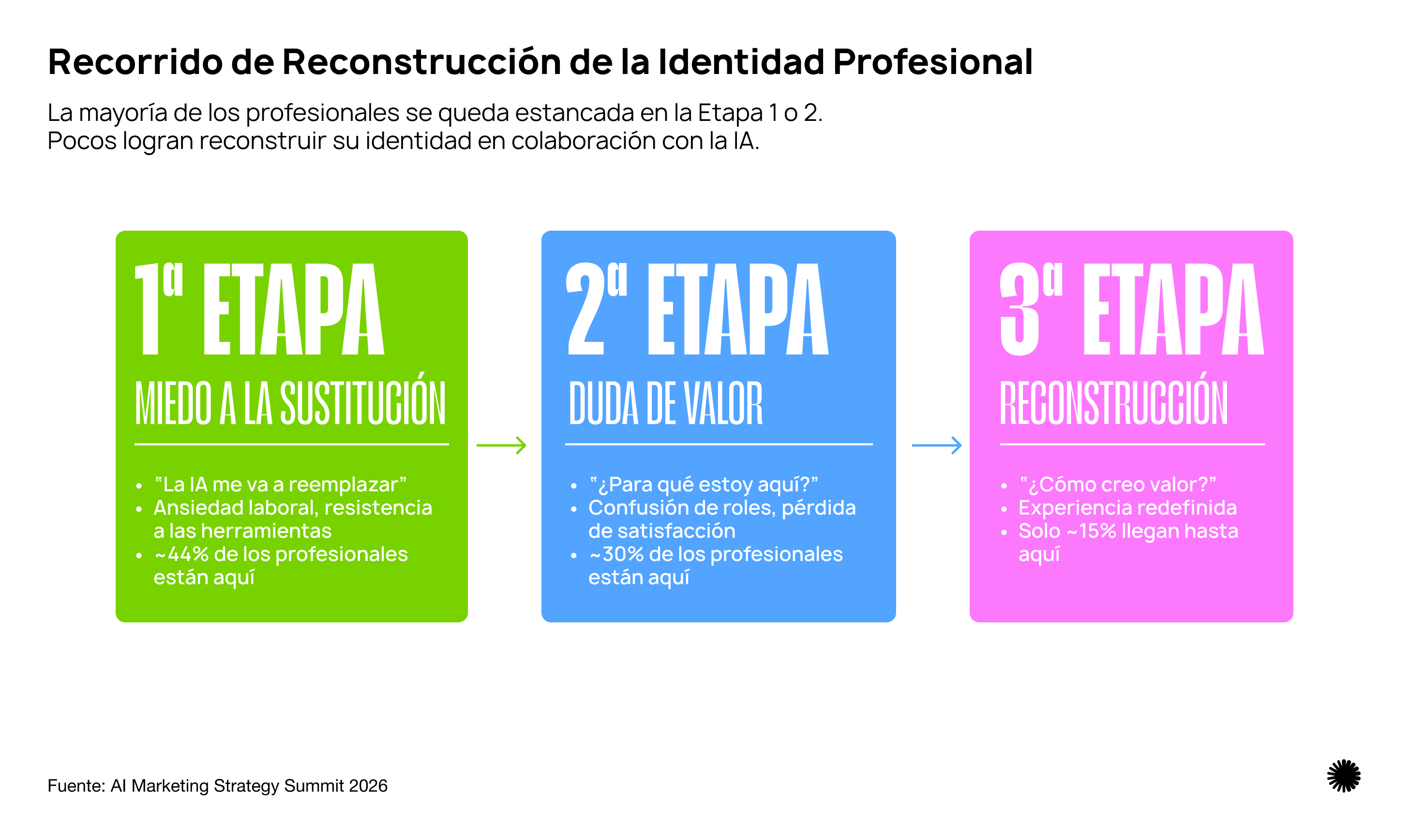 La investigación presentada en el Summit identificó tres etapas por las que pasan los profesionales al redefinir su valor en entornos potenciados por IA. (Fuente: AI Marketing Strategy Summit 2026)